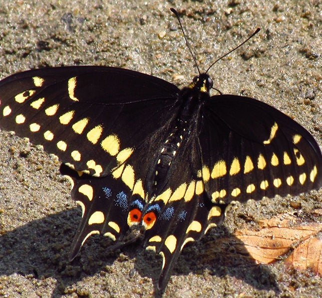 Le dessus de ses ailes est noir avec des rangées de taches jaunes sur les bords (ailes postérieures et antérieures). Ses ailes postérieures se prolongent par deux pointes bien visibles qui évoquent la queue d’une hirondelle. Il possède aussi une rangée de taches bleues et des ocelles orange rougeâtre sur les ailes postérieures.