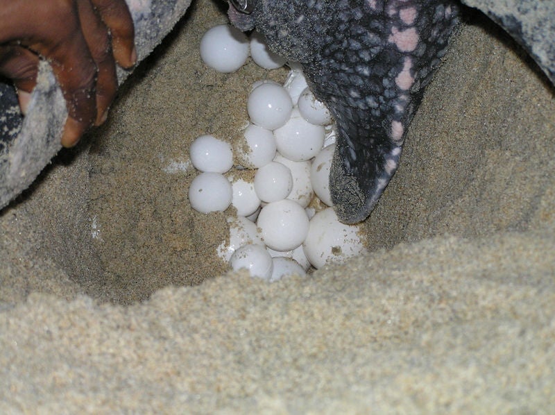 The female turtle lays her eggs in a nest chamber she excavates with her rear flippers. She will lay an average of 60 to 100 eggs per clutch, and then she covers them with sand before leaving the nesting site and returning to the sea. Hatchling leatherbacks will emerge approximately 60 to 65 days later. The hatchlings immediately propel themselves using their front flippers across the beach towards the sea, where they will spend their entire lives—until they grow up and the females return to land to nest.