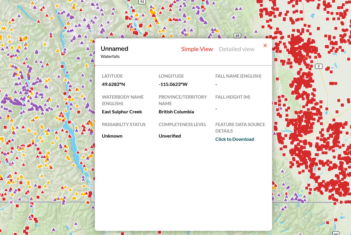 The CABD web tool can be found at aquaticbarriers.ca; check it out today! The web tool allows users to explore and visualize the barriers, view associated attributes, and filter and download the data for further exploration. To learn more about the CABD, how to use the web tool, explore our data sources, and how to help us fill data gaps, check out the CABD documentation site.