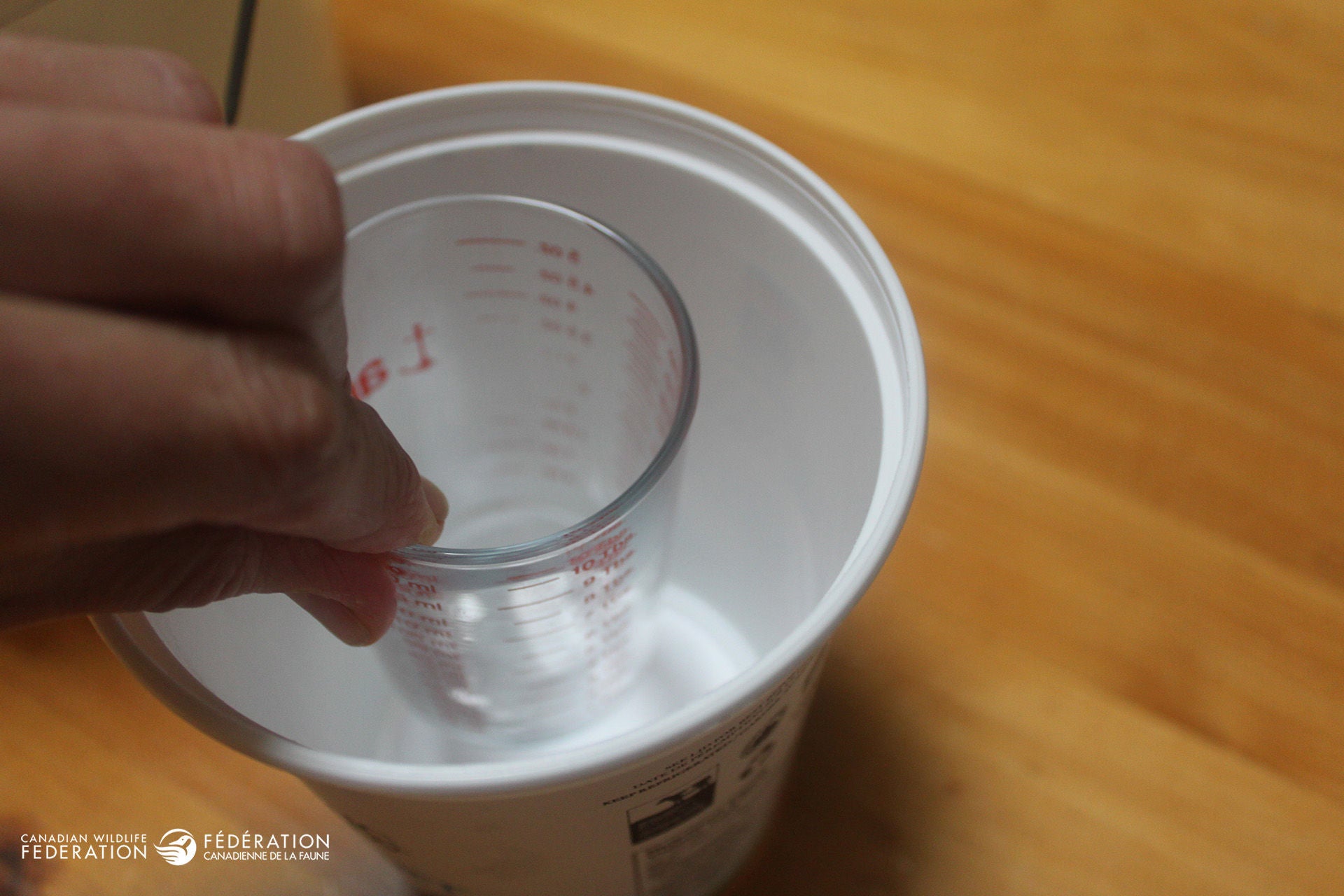 You’ll also need to check that it is tall enough – as tall or taller than your large container - keeping in mind that it won’t sit directly on the bottom of your large container but a little higher. This allows space for ice to form the base of your lantern. Also make sure it is large enough to place a tea light in that spot once it’s removed. The width is also very important for if your large container is very large and you use a narrow inner container, that could mean a very deep drop for a tea light and no space for your hand to reach in and light it safely.