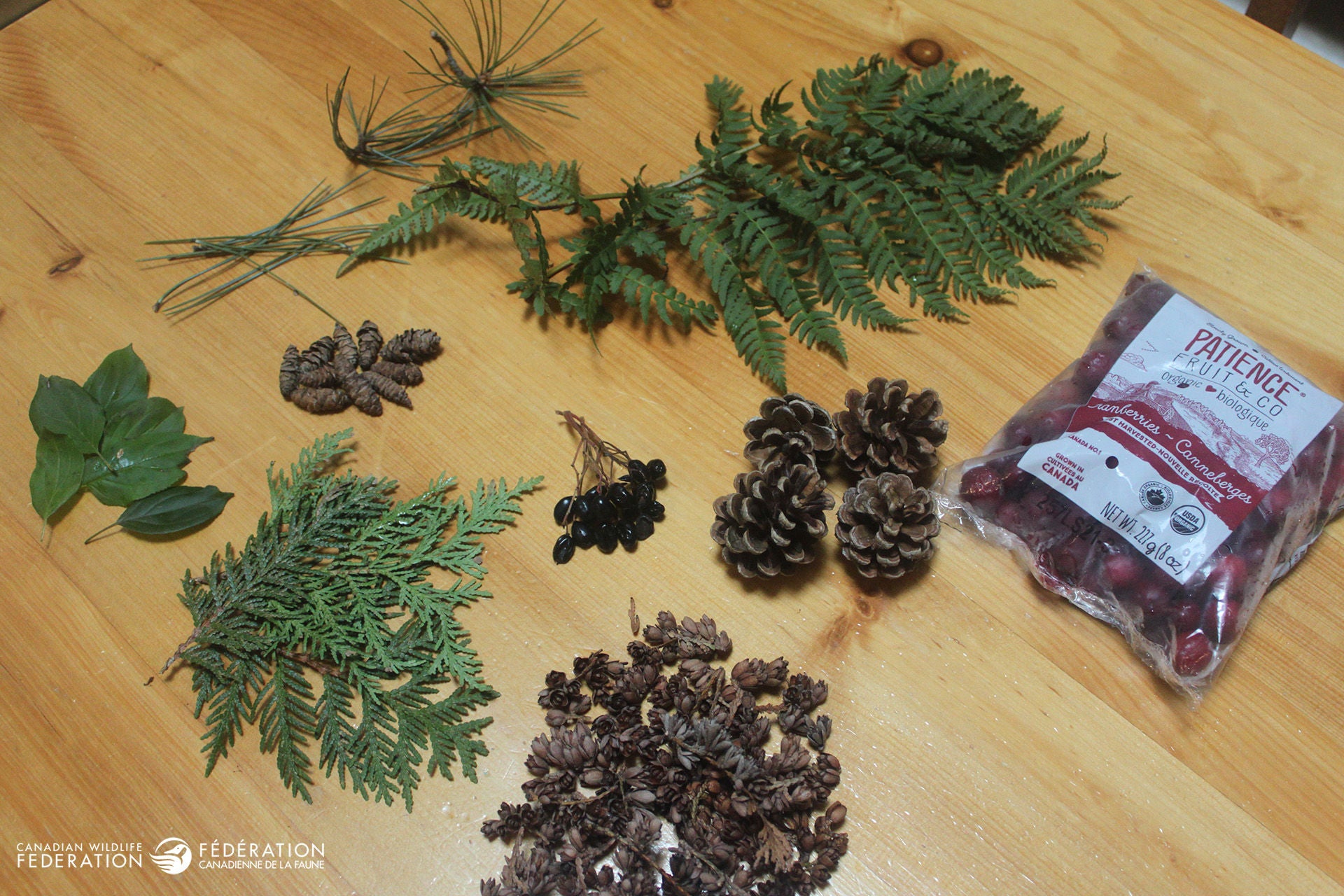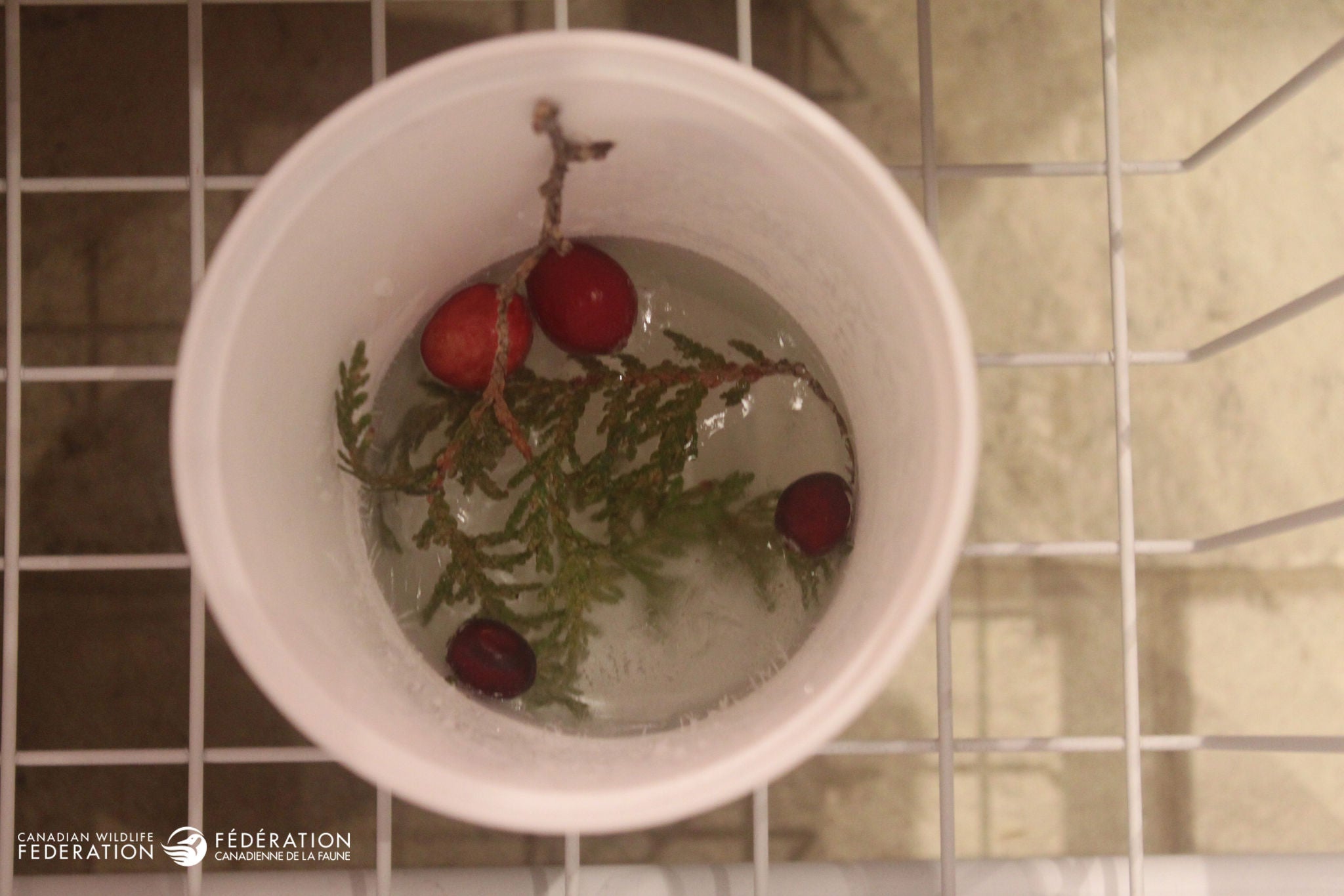 Natural items like fresh or frozen cranberries and evergreens. Fresh or frozen cranberries from the store are attractive as are other berries that you might have growing on bushes in your garden. (You won’t need many, so the birds will end up getting most of them). You could also slice an orange or clementine and use that for added colour.
