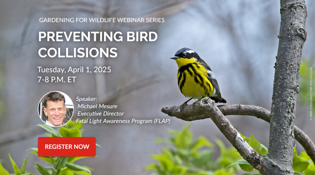 Each year in Canada approximately 25 million birds die from building collisions. This is not only heartbreaking to witness but is a significant loss to biodiversity and the role these birds play. The good news is that there are solutions! Join the Canadian Wildlife Federation on Tuesday, April 1 at 7:00 p.m. ET to discover effective ways to prevent bird strikes at home, work or at the cottage. Our guest will be Michael Mesure, a founding member and Executive Director of Fatal Light Awareness Program (FLAP) Canada. Michael will speak about the work of FLAP Canada, how human-made structures threatens birds and offer solutions for mitigating building collisions. This will include examples of both effective and ineffective collision deterrent methods and some background on bird-friendly building design guidelines, policies, code and law.