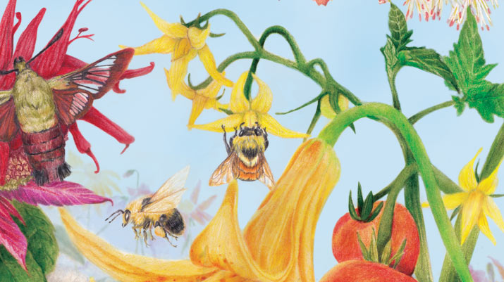 This illustration shows native pollinators from all over Canada interacting with their environment and foraging among cultivated and native plants at various times of the year. Some are favourites, others are less known or feared, but all are extremely important.Pollinators are animals that transfer pollen from one flower to another, mainly while drinking nectar and gathering pollen.