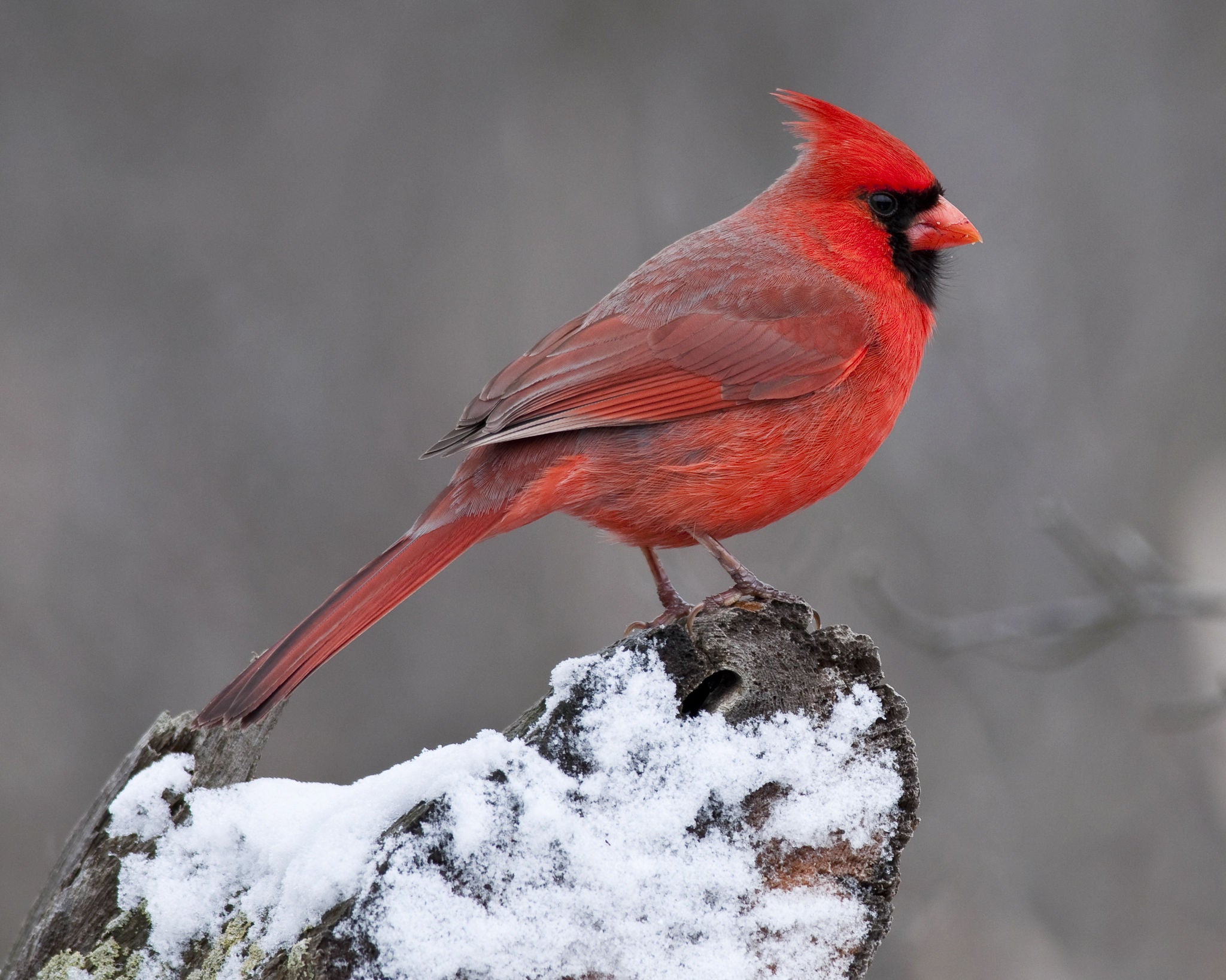 The northern cardinal is a medium-sized songbird, with males slightly larger than females. Males are bright red with a black mask around their red bill and a prominent crest on the top of their head. Females are olive brown with red on their wings, tail, and crest, and a red bill. Juveniles are similar in colour to females but have a black bill and a shorter crest.