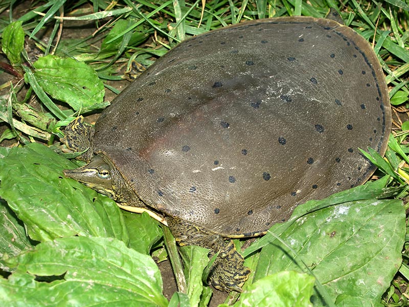 The Spiny Softshell Turtle has a flat leathery shell that is a greenish-brown. It has a long neck and a tubular nose.