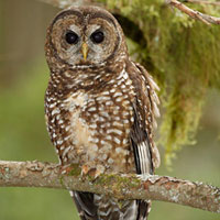 The Northern Spotted Owl is a fairly large, brown owl, 40 to 48 centimetres long, with a puffy round head and no ear tufts. The chocolate to chestnut brown feathers of the head, neck, back and under-parts have many circular or irregular white spots, for which this attractive owl is named. The Northern Spotted Owl has large, round facial discs with dark outer rims, dark brown eyes and a yellowish-green bill.