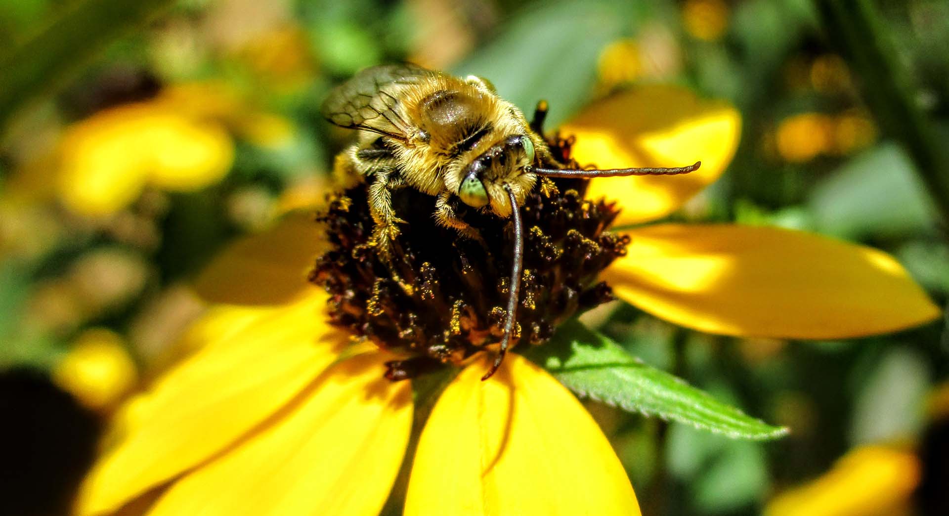 Long-horned bees are medium to large bees (10 to 17 mm) depending on species. They are named after the males’ extended antennas; there are 14 genera in this group that varies in morphology. In Canada, the main ones are Eucera (encompassing the squash bee previously presented), and Melissodes. Both genera have well-developed scopae on their hind legs with thick hairs that are usually white, orange or black.
