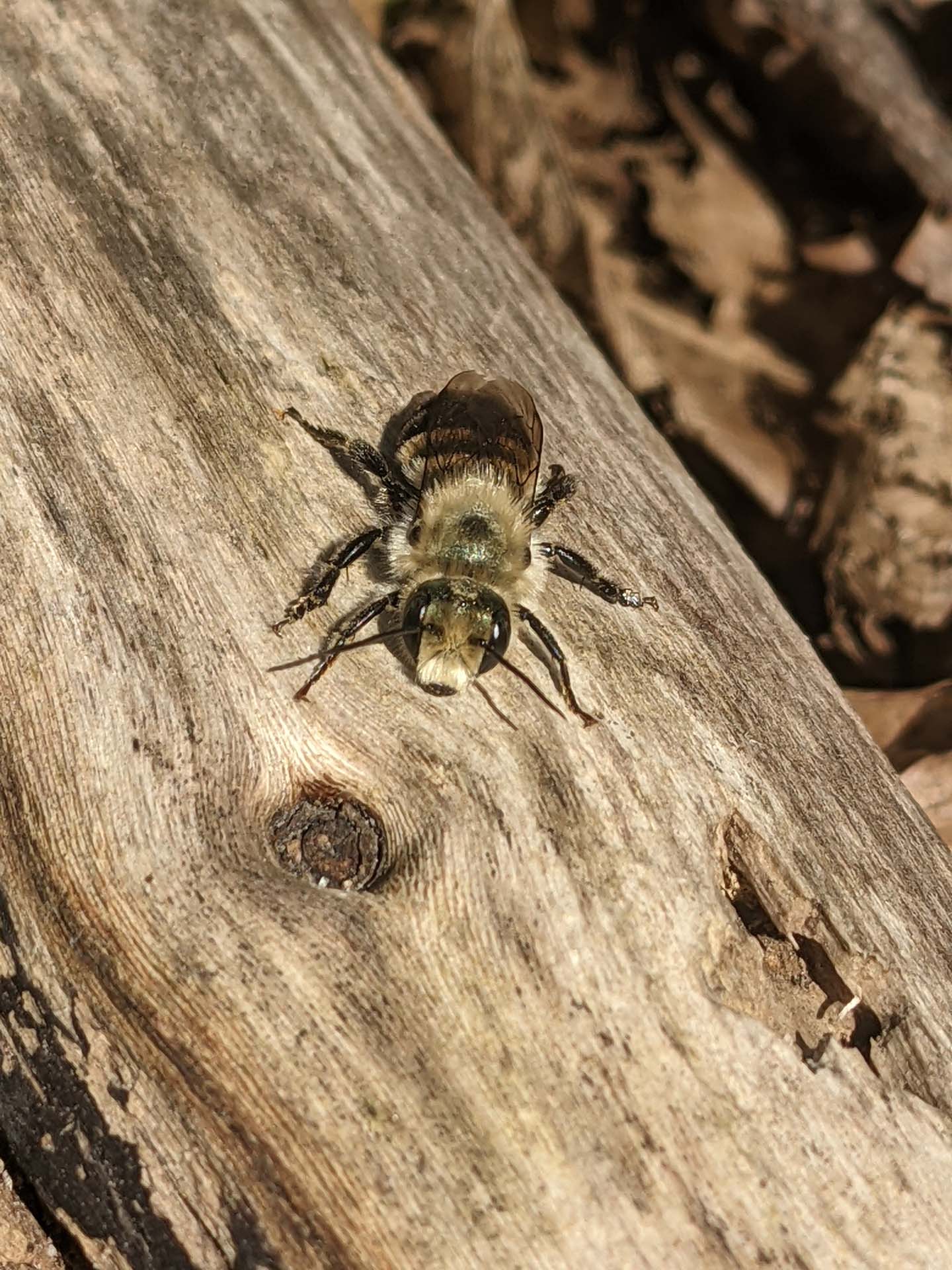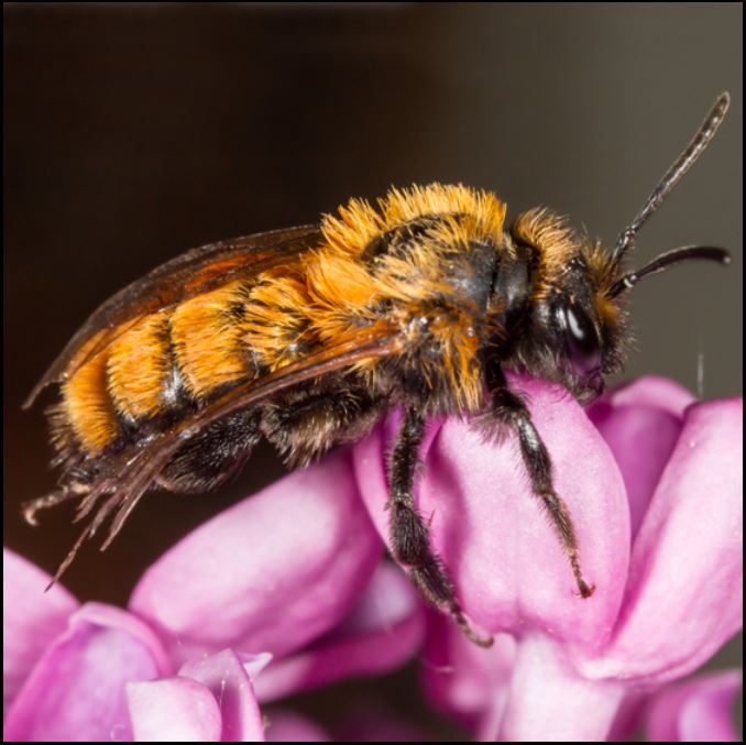 Mining bees are small to medium sized bees (six to 14 mm). Andrena is one of the largest bee genera and approximately 100 species thrive in Canada. They have a furry head and thorax with varying colors, from orange to whitish. All Andrena females have a patch of velvety hairs on their faces near their eyes, called facial foveae, but it’s usually hard to see it without a microscope. Different species show various hair patterns on their abdomen, with or without stripes.