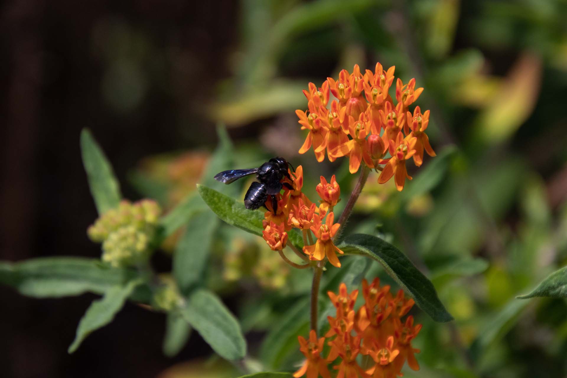 Large carpenter bees are massive—some of the biggest bees (17 to 23 mm) found in Canada—generally furry and dark-colored. Some species are completely black while others have white/creamy hairs on the upper body. There are about 10 species of Xylocopa in Canada and they tend to live in restricted areas: the Great Lakes region in the east and British Columbia are the two main regions where you can find them but they can be found elsewhere too.
