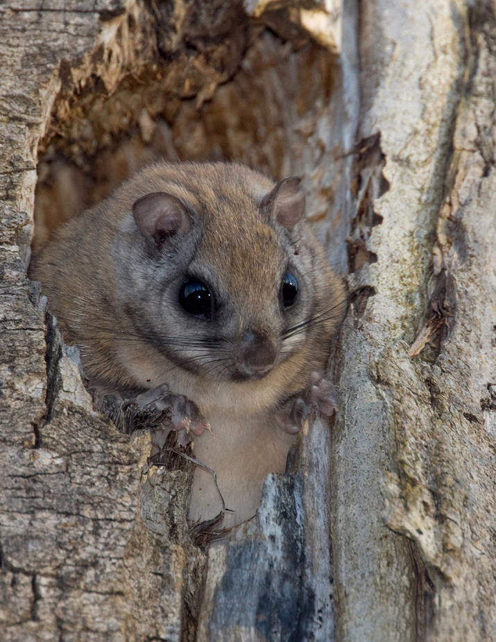 Northern flying squirrels are about 30 cm in length and have broad flattened tails. The fur on their back is a cinnamon brown and they have white bellies. The large eyes of flying squirrels facilitate effective night vision. This is necessary because, unlike their more commonly seen cousins, these squirrels hide away during the day and become active about an hour after sunset.