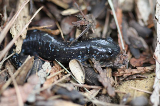 The Blue-spotted Salamander is a small, cold-blooded, nocturnal animal. A large adult will only be about 12 cm long, 40% of that is tail and its body is only about 1 cm wide. It is shiny-black with dusty blue spots mainly on the sides and belly.