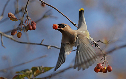 Cedar Waxwings eat small fruit year round. They will feed from shrubs and trees like mountain ash, dogwoods, serviceberries, crabapples, hawthorns and winterberries. In the warmer months, Cedar Waxwings will also eat insects found on vegetation and around streams, ponds and rivers.