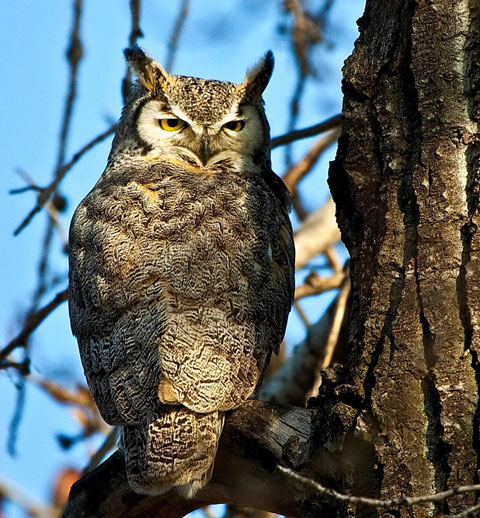 The Great Horned Owl is one of Canada’s commonest large birds of prey. The most notable physical attributes are its large size and prominent ear tufts or "horns." A predator that hunts at night, this owl has enormous yellow eyes set in a broad face, a curved beak and claws, and long fluffy feathers. Its coloration tends mainly toward brown or grey-brown, with conspicuous barring. This bird’s legendary hooting sounds like a soft yet vibrant whoo-hoo-ho-o-o.