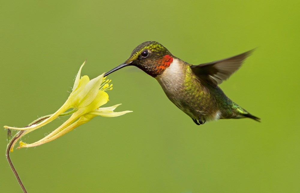 Female ruby-throated hummingbird feeding from a petunia. Image: Corel Hummingbirds will feed from any colour, but may visit red, purple, blue and yellow flowers first. The more the bloom colour contrasts with the flower’s background, the more likely a hummingbird is to visit. Because of their long tongues, hummingbirds show a preference for bell- or trumpet-shaped flowers.