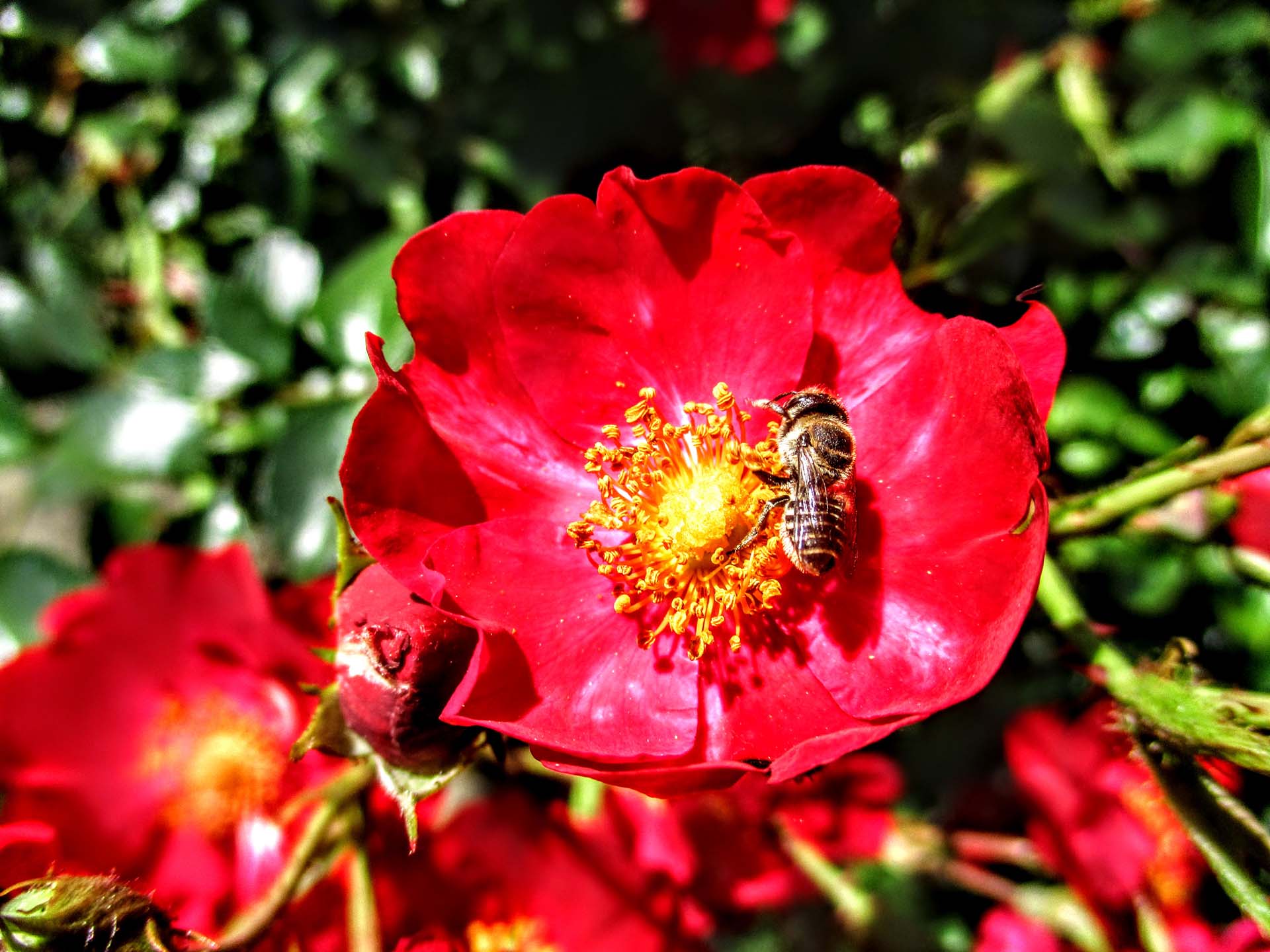 Bees and wasps are close relatives which explains why they look very similar. Bees often have hairs specially adapted to collect and carry pollen on their bodies, legs or abdomen. Wasps, on the other hand, are typically not as hairy as most do not collect pollen to feed their young. A group of bees called cuckoo bees, do not harvest pollen and instead “steal” the nest of other bees; those bees resemble wasps in their appearance which makes it much harder to differentiate the two groups for the untrained eye (at least for this group of bees).