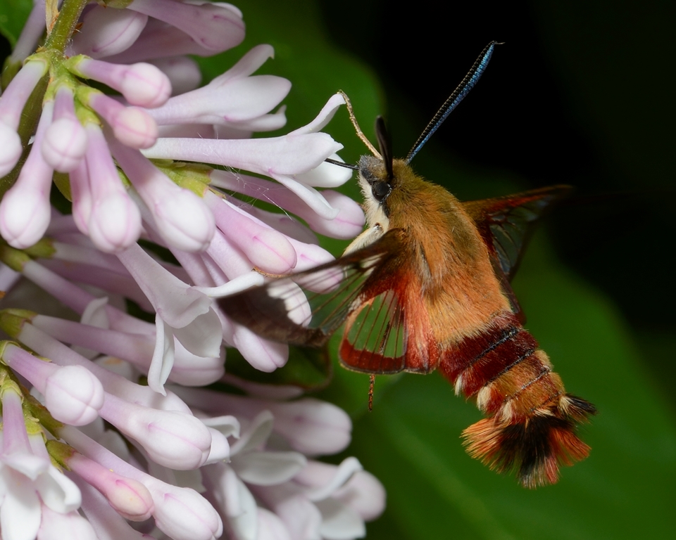 Unlike most other moths, clearwing hummingbird moths are active during the day. They can be seen fluttering around fields, forest edges, meadows and cultivated gardens extracting nectar from flower blossoms. The far-ranging species can be found from Newfoundland west to British Columbia, and even in Canada’s North.