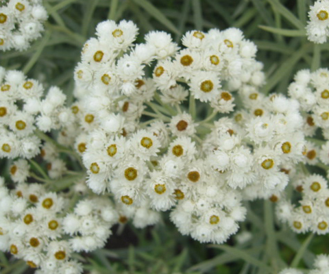 Pearly everlasting can grow to up to nearly a metre tall and can eventually bush out equally as wide. The clusters of white flowers have yellow centres and bloom for many weeks from mid-summer through to early fall. The leaves are long and narrow with a silvery hue, thanks to the fine hairs that cover its leaves and stems.