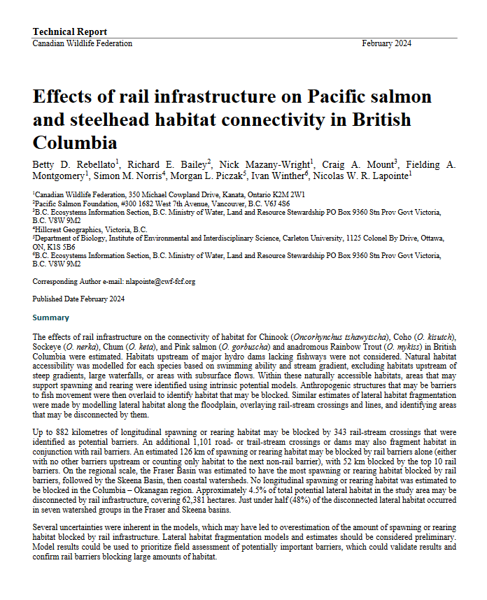 The effects of rail infrastructure on the connectivity of habitat for Chinook (Oncorhynchus tshawytscha), Coho (O. kisutch), Sockeye (O. nerka), Chum (O. keta), and Pink salmon (O. gorbuscha) and anadromous Rainbow Trout (O. mykiss) in British Columbia were estimated. Habitats upstream of major hydro dams lacking fishways were not considered. Natural habitat accessibility was modelled for each species based on swimming ability and stream gradient, excluding habitats upstream of steep gradients, large waterfalls, or areas with subsurface flows. Within these naturally accessible habitats, areas that may support spawning and rearing were identified using intrinsic potential models. Anthropogenic structures that may be barriers to fish movement were then overlaid to identify habitat that may be blocked. Similar estimates of lateral habitat fragmentation were made by modelling lateral habitat along the floodplain, overlaying rail-stream crossings and lines, and identifying areas that may be disconnected by them