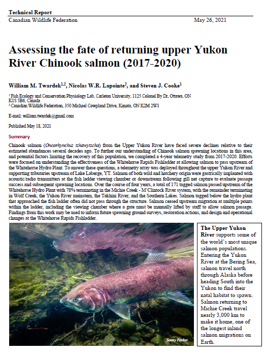Chinook salmon (Oncorhynchus tshawytscha) from the Upper Yukon River have faced severe declines relative to their estimated abundances several decades ago. To further our understanding of Chinook salmon spawning locations in this area, and potential factors limiting the recovery of this population, we completed a 4-year telemetry study from 2017-2020. Efforts were focused on understanding the effectiveness of the Whitehorse Rapids Fishladder at allowing salmon to pass upstream of the Whitehorse Hydro Plant. To answer these questions, a telemetry array was deployed throughout the upper Yukon River and supporting tributaries upstream of Lake Laberge, YT. Salmon of both wild and hatchery origin were gastrically implanted with acoustic/radio transmitters at the fish ladder viewing chamber or downstream following gill net capture to evaluate passage success and subsequent spawning locations. Over the course of four years, a total of 171 tagged salmon passed upstream of the Whitehorse Hydro Plant with 78% terminating in the Michie Creek - M’Clintock River system, with the remainder terminating in Wolf Creek, the Yukon River mainstem, the Takhini River, and the Southern Lakes. Salmon tagged below the hydro plant that approached the fish ladder often did not pass through the structure. Salmon ceased upstream migration at multiple points within the ladder, including the viewing chamber where a gate must be manually lifted by staff to allow salmon passage. Findings from this work may be used to inform future spawning ground surveys, restoration actions, and design and operational changes at the Whitehorse Rapids Fishladder.