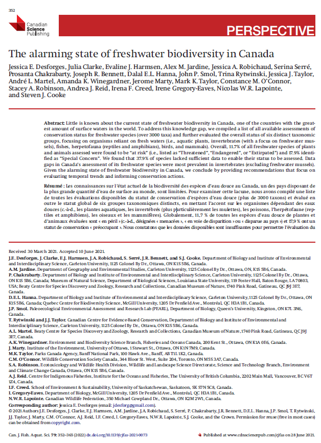 Little is known about the current state of freshwater biodiversity in Canada, one of the countries with the greatest amount of surface waters in the world. To address this knowledge gap, we compiled a list of all available assessments of conservation status for freshwater species (over 3000 taxa) and further evaluated the overall status of six distinct taxonomic groups, focusing on organisms reliant on fresh waters (i.e., aquatic plants, invertebrates (with a focus on freshwater mussels), fishes, herpetofauna (reptiles and amphibians), birds, and mammals). Overall, 11.7% of all freshwater species of plants and animals assessed were found to be “at risk” (i.e., listed as “Threatened”, “Endangered”, or “Extirpated”) and 17.9% identified as “Special Concern”. We found that 37.9% of species lacked sufficient data to enable their status to be assessed. Data gaps in Canada’s assessment of its freshwater species were most prevalent in invertebrates (excluding freshwater mussels). Given the alarming state of freshwater biodiversity in Canada, we conclude by providing recommendations that focus on evaluating temporal trends and informing conservation actions.