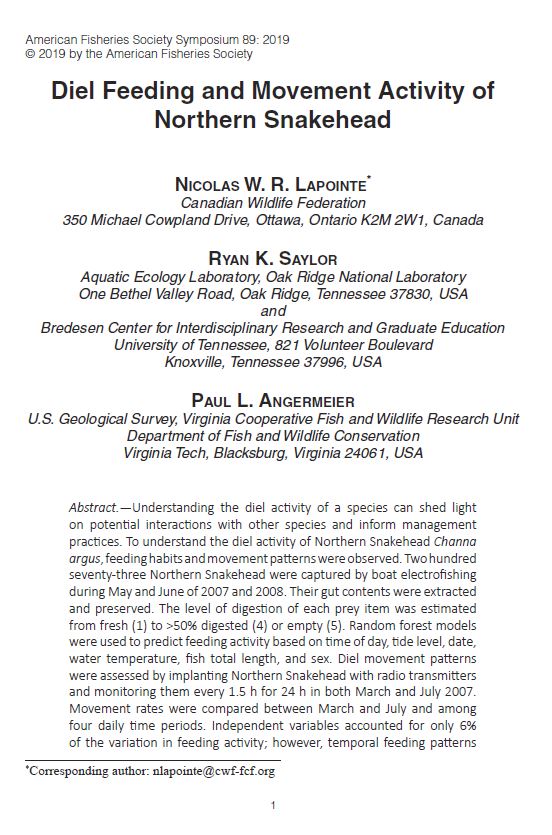 Understanding the diel activity of a species can shed light on potential interactions with other species and inform management practices. To understand the diel activity of Northern Snakehead Channa argus, feeding habits and movement patterns were observed. Two hundred seventy-three Northern Snakehead were captured by boat electrofishing during May and June of 2007 and 2008.