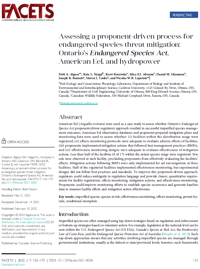 Assessing a proponent-driven process for endangered species threat mitigation: Ontario’s Endangered Species Act, American Eel, and hydropower