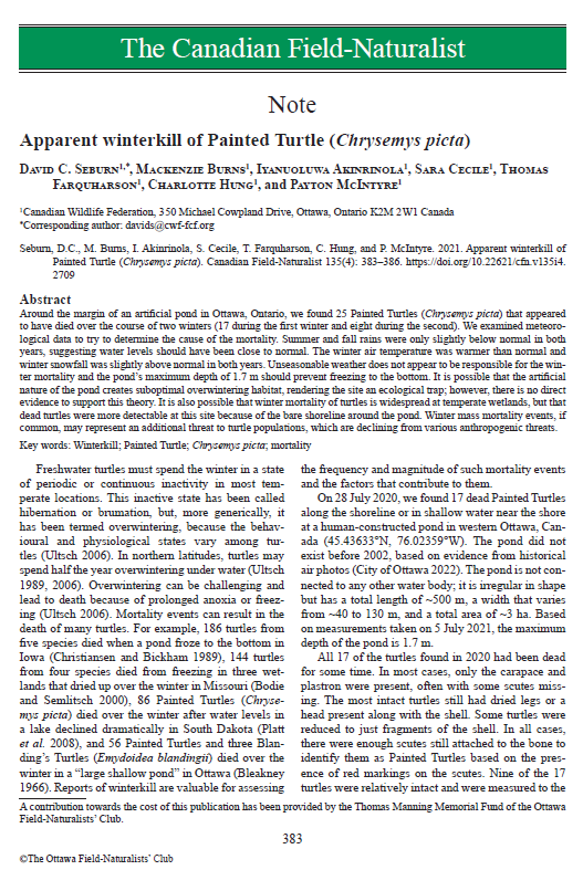 Around the margin of an artificial pond in Ottawa, Ontario, we found 25 Painted Turtles (Chrysemys picta) that appeared to have died over the course of two winters (17 during the first winter and eight during the second). We examined meteorological data to try to determine the cause of the mortality. Summer and fall rains were only slightly below normal in both years, suggesting water levels should have been close to normal. The winter air temperature was warmer than normal and winter snowfall was slightly above normal in both years. Unseasonable weather does not appear to be responsible for the winter mortality and the pond’s maximum depth of 1.7 m should prevent freezing to the bottom. It is possible that the artificial nature of the pond creates suboptimal overwintering habitat, rendering the site an ecological trap; however, there is no direct evidence to support this theory. It is also possible that winter mortality of turtles is widespread at temperate wetlands, but that dead turtles were more detectable at this site because of the bare shoreline around the pond. Winter mass mortality events, if common, may represent an additional threat to turtle populations, which are declining from various anthropogenic threats.