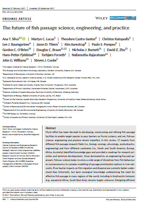 Much effort has been devoted to developing, constructing and refining fish passage facilities to enable target species to pass barriers on fluvial systems, and yet, fishway science, engineering and practice remain imperfect. In this review, 17 experts from different fish passage research fields (i.e., biology, ecology, physiology, ecohydraulics, engineering) and from different continents (i.e., North and South America, Europe, Africa, Australia) identified knowledge gaps and provided a roadmap for research priorities and technical developments. Once dominated by an engineering-focused approach, fishway science today involves a wide range of disciplines from fish behaviour to socioeconomics to complex modelling of passage prioritization options in river networks. River barrier impacts on fish migration and dispersal are currently better understood than historically, but basic ecological knowledge underpinning the need for effective fish passage in many regions of the world, including in biodiversity hotspots (e.g., equatorial Africa, South-East Asia), remains largely unknown. Designing efficient