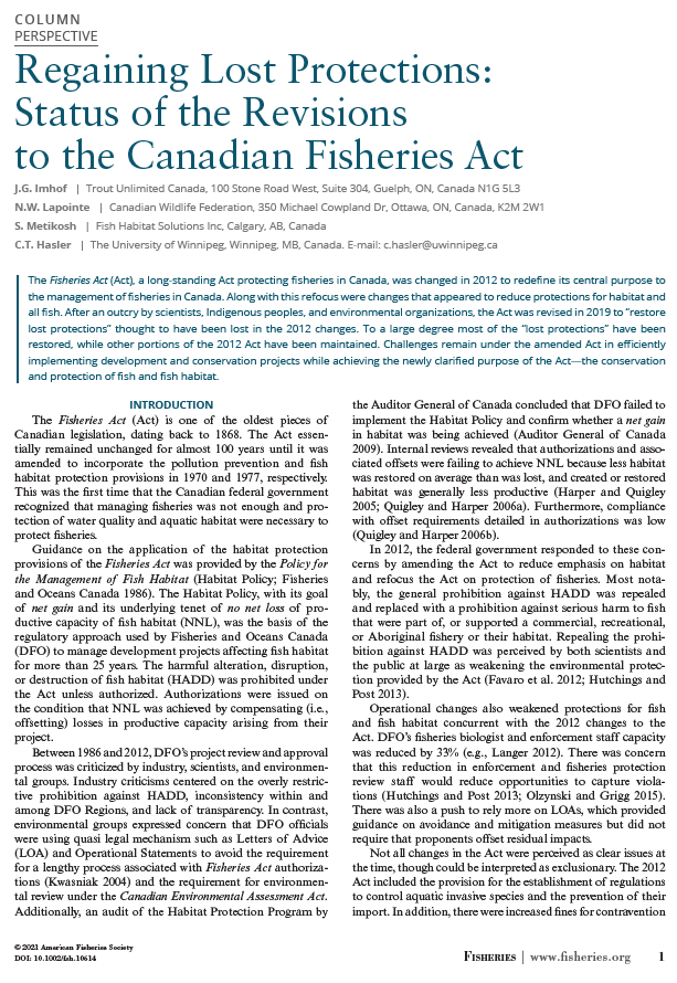 The Fisheries Act (Act), a long-standing Act protecting fisheries in Canada, was changed in 2012 to redefine its central purpose to the management of fisheries in Canada. Along with this refocus were changes that appeared to reduce protections for habitat and all fish. After an outcry by scientists, Indigenous peoples, and environmental organizations, the Act was revised in 2019 to “restore lost protections” thought to have been lost in the 2012 changes. To a large degree most of the “lost protections” have been restored, while other portions of the 2012 Act have been maintained. Challenges remain under the amended Act in efficiently implementing development and conservation projects while achieving the newly clarified purpose of the Act—the conservation and protection of fish and fish habitat.