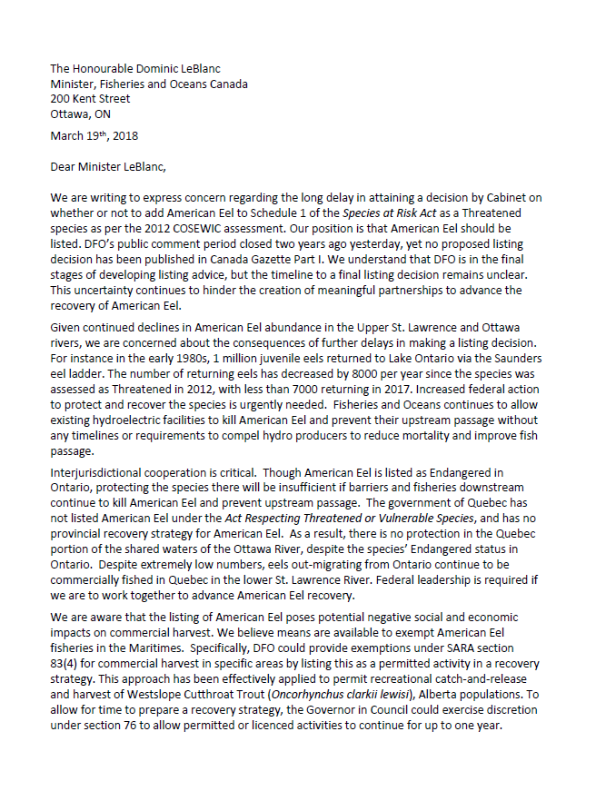 We are writing to express concern regarding the long delay in attaining a decision by Cabinet on whether or not to add American Eel to Schedule 1 of the Species at Risk Act as a Threatened species as per the 2012 COSEWIC assessment. Our position is that American Eel should be listed. DFO’s public comment period closed two years ago yesterday, yet no proposed listing decision has been published in Canada Gazette Part I. We understand that DFO is in the final stages of developing listing advice, but the timeline to a final listing decision remains unclear. This uncertainty continues to hinder the creation of meaningful partnerships to advance the recovery of American Eel.