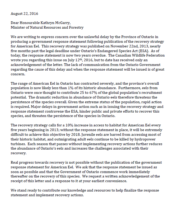 We are writing regarding your response, dated September 13th, 2016, to the letter sent by the Canadian Wildlife Federation, Ottawa Riverkeeper, Ontario Rivers Alliance and Ontario Nature on August 22nd, 2016 expressing concern over the delay by the Province of Ontario in producing a government response statement (GRS) following publication of the Recovery Strategy for American Eel. In your response, you indicated that a draft would be ready for public consultation this winter.