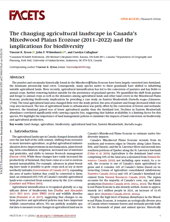 The prairies and savannahs historically found in the Mixedwood Plains Ecozone have been largely converted into farmland, the dominant present-day land cover. Consequently, many species native to these grasslands have shifted to inhabiting suitable agricultural lands. More recently, agricultural intensification has led to the conversion of pastures and hay fields to annual crops, further removing habitat suitable for the persistence of grassland species. We quantified the shift from pasture and forage to annual crops as well as the dynamics among agricultural lands and other land covers in the Mixedwood Plains Ecozone, predicting biodiversity implications by providing a case study on Eastern Meadowlark (Sturnella magna (Linnaeus, 1758)). The total agricultural land area changed little over the study period, but area of pasture and forage decreased while row crop area increased. The loss of agricultural lands to urbanization was partly offset by the conversion of forests and wetlands; however, the farmland gained was of lesser agricultural quality than the farmland lost. Declines in Eastern Meadowlark abundance correlated significantly with carrying capacity loss, suggesting that habitat availability is a limiting factor for this species.We highlight the importance of land management policies tominimize the impacts of land conversion on biodiversity and agricultural production.