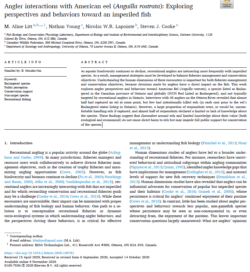 As aquatic biodiversity continues to decline, recreational anglers are interacting more frequently with imperiled species. As a result, management strategies must be developed to balance fisheries management and conservation objectives. Understanding the human dimensions of these encounters is important for both fisheries management and conservation objectives, because decisions made by anglers have a direct impact on the fish. This work explores angler perspectives and behaviors toward American Eel (Anguilla rostrata), a species listed as Endangered in the Canadian province of Ontario and globally (IUCN Red Listed as Endangered), and not typically targeted by recreational anglers in Ontario. Interviews with 48 anglers on the Ottawa River revealed that almost half had captured an eel at some point, but few had intentionally killed eels (in each case prior to the eel’s Endangered status listing in Ontario). However, a large proportion of respondents were, or would be, uncomfortable handling eels if captured, and almost half of respondents declared a limited or lack of knowledge about the species. These findings suggest that discomfort around eels and limited knowledge about their value (both ecological and economical) do not cause direct harm to eels but may impede full public support for conservation of the species.