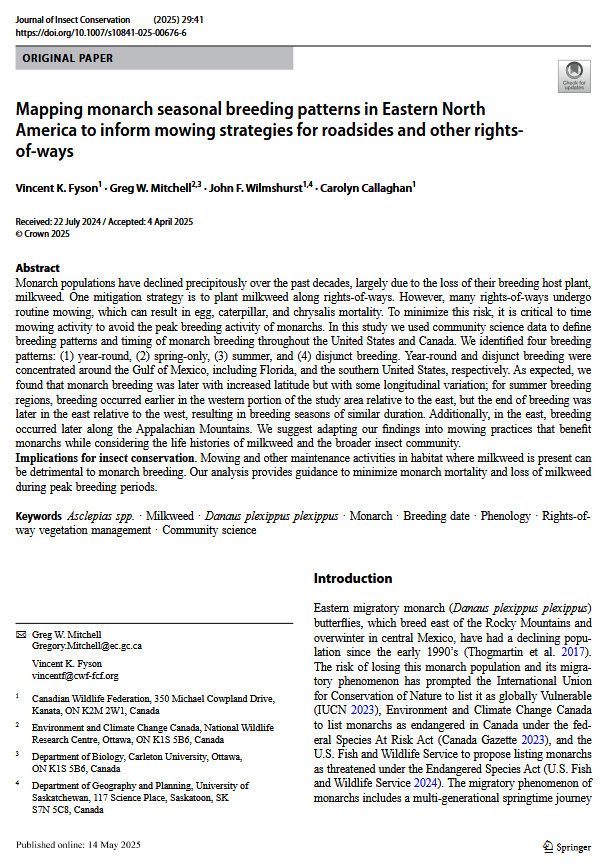 Mapping monarch seasonal breeding patterns in Eastern North America to inform mowing strategies for roadsides and other rights-of-ways