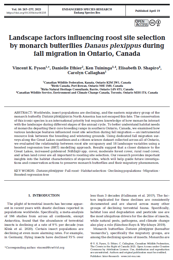 Landscape factors influencing roost site selection by monarch butterflies Danaus plexippus during fall migration in Ontario, Canada