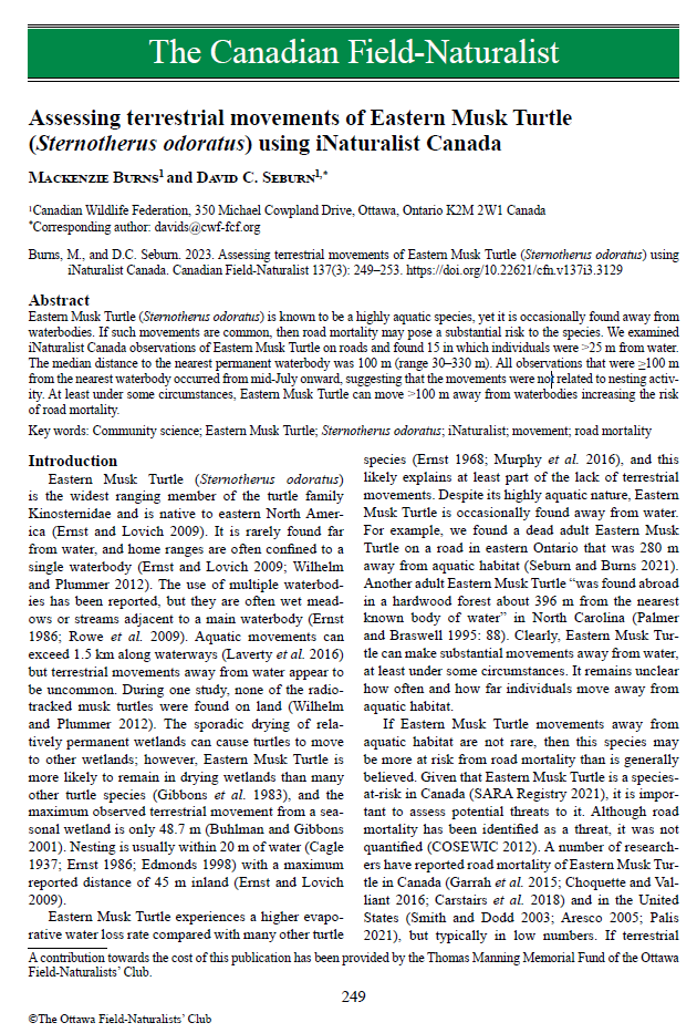 Assessing terrestrial movements of Eastern Musk Turtle (Sternotherus odoratus) using iNaturalist Canada