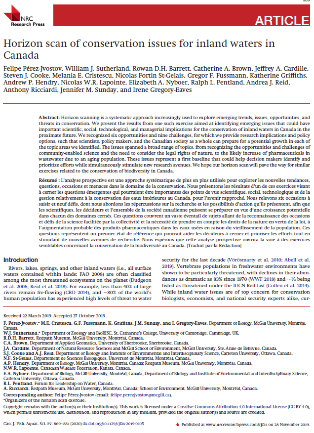 Horizon scanning is a systematic approach increasingly used to explore emerging trends, issues, opportunities, and threats in conservation. We present the results from one such exercise aimed at identifying emerging issues that could have important scientific, social, technological, and managerial implications for the conservation of inland waters in Canada in the proximate future. We recognized six opportunities and nine challenges, for which we provide research implications and policy options, such that scientists, policy makers, and the Canadian society as a whole can prepare for a potential growth in each of the topic areas we identified. The issues spanned a broad range of topics, from recognizing the opportunities and challenges of community-enabled science and the need to consider the legal rights of nature, to the likely increase of pharmaceuticals in wastewater due to an aging population. These issues represent a first baseline that could help decision makers identify and prioritize efforts while simultaneously stimulate new research avenues. We hope our horizon scan will pave the way for similar exercises related to the conservation of biodiversity in Canada.