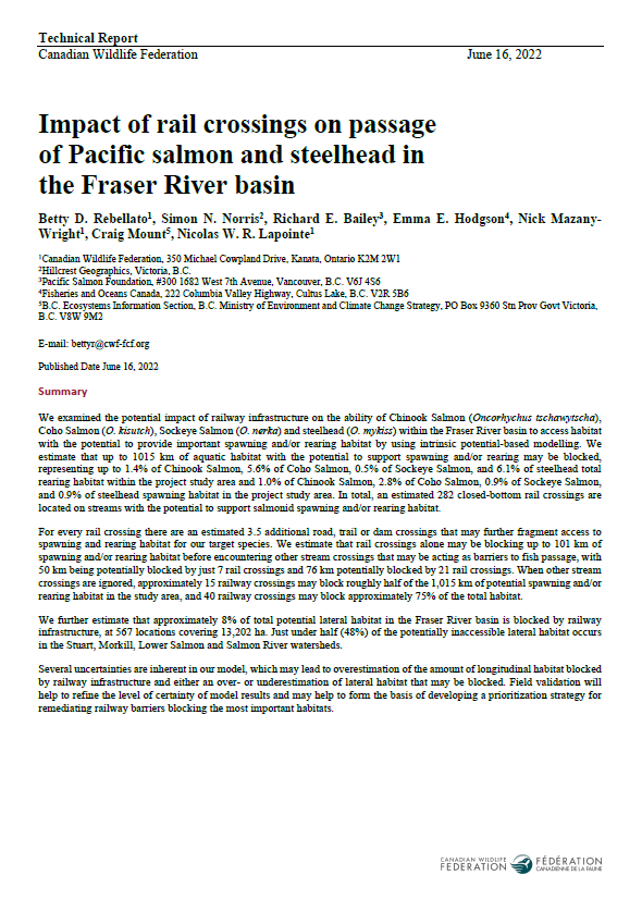 We examined the potential impact of railway infrastructure on the ability of Chinook Salmon (Oncorhychus tschawytscha), Coho Salmon (O. kisutch), Sockeye Salmon (O. nerka) and steelhead (O. mykiss) within the Fraser River basin to access habitat with the potential to provide important spawning and/or rearing habitat by using intrinsic potential-based modelling. We estimate that up to 1015 km of aquatic habitat with the potential to support spawning and/or rearing may be blocked, representing up to 1.4% of Chinook Salmon, 5.6% of Coho Salmon, 0.5% of Sockeye Salmon, and 6.1% of steelhead total rearing habitat within the project study area and 1.0% of Chinook Salmon, 2.8% of Coho Salmon, 0.9% of Sockeye Salmon, and 0.9% of steelhead spawning habitat in the project study area. In total, an estimated 282 closed-bottom rail crossings are located on streams with the potential to support salmonid spawning and/or rearing habitat.