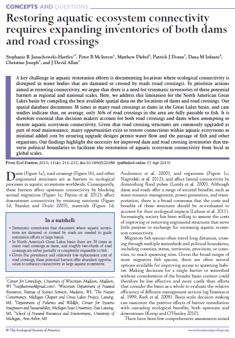 Freshwater aquatic connectivity is an increasingly important, but underdeveloped area of focus in the study of ecosystem processes and conservation efforts at a national scale in Canada. Barriers to aquatic connectivity can include manmade infrastructure such as dams, weirs, culverts, and roadstream crossings, as well as natural features such as waterfalls. These include both barriers in the longitudinal plane (i.e., upstream-downstream), as well as lateral barriers disconnecting rivers and lakes from their riparian wetlands and floodplains. These barriers within freshwater systems limit the movements of aquatic organisms, many of which rely on annual migrations within or between freshwater and marine ecosystems to complete their life cycles, and disrupt ecological process including nutrient cycling, sediment flows, and temperature regulation.