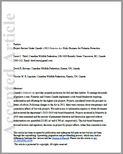 Project Review Under Canada’s 2012 Fisheries Act: Risky Business for Fisheries Protection