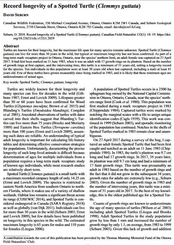 Turtles are known for their longevity, but the maximum life span for many species remains unknown. Spotted Turtle (Clemmys guttata) can live for more than 30 years in the wild, but typical or maximum longevity has not been confirmed. As part of a long-term mark–recapture project in Ottawa, Ontario, near the species’ northern limit, an adult female was captured on 27 April 2017. It had first been marked on 11 June 1983, when it was an adult with 17 growth rings on its plastron. Based on the number of growth rings at first capture, and the intervening time, this turtle is a minimum of 51 years old, setting a longevity record for the species. Ten individuals in this population were at least 30 years old when last captured, including a male at least 41 years old. Few of these turtles have grown measurably since being marked in 1983, and it is likely that these minimum ages are underestimates of actual ages.