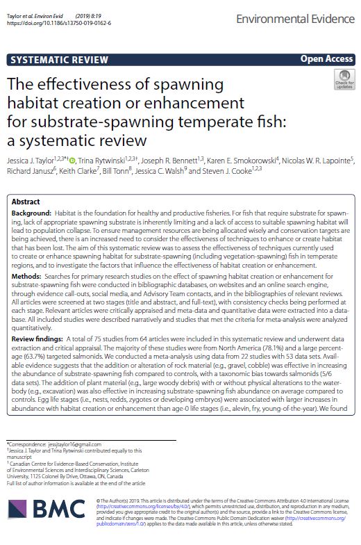Habitat is the foundation for healthy and productive fisheries. For fish that require substrate for spawning, lack of appropriate spawning substrate is inherently limiting and a lack of access to suitable spawning habitat will lead to population collapse. To ensure management resources are being allocated wisely and conservation targets are being achieved, there is an increased need to consider the effectiveness of techniques to enhance or create habitat that has been lost.