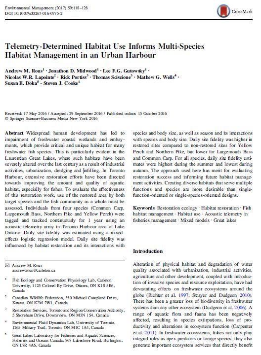 Widespread human development has led to impairment of freshwater coastal wetlands and embayments, which provide critical and unique habitat for many freshwater fish species. This is particularly evident in the Laurentian Great Lakes, where such habitats have been severely altered over the last century as a result of industrial activities, urbanization, dredging and infilling. In Toronto Harbour, extensive restoration efforts have been directed towards improving the amount and quality of aquatic habitat, especially for fishes.