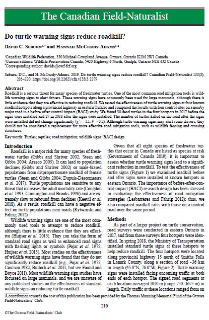 Roadkill is a serious threat for many species of freshwater turtles. One of the most common road mitigation tools is wildlife warning signs to alert drivers. These warning signs have commonly been used for large mammals, although there is little evidence that they are effective in reducing roadkill. We tested the effectiveness of turtle warning signs at four known roadkill hotspots along a provincial highway in eastern Ontario and compared the results with four control sites on a nearby major road in a before-after-control-impact (BACI) study. We found 30 dead turtles in the four hotspots in 2017 before the signs were installed and 27 in 2018 after the signs were installed. The number of turtles killed on the road after the signs were installed did not change significantly (χ21 = 1.1, P > 0.2). Although turtle warning signs may alert some drivers, they should not be considered a replacement for more effective road mitigation tools, such as wildlife fencing and crossing structures.