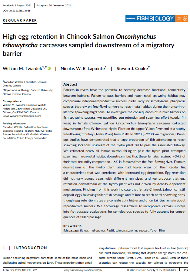 High egg retention in Chinook Salmon Oncorhynchus tshawytscha carcasses sampled downstream of a migratory barrier