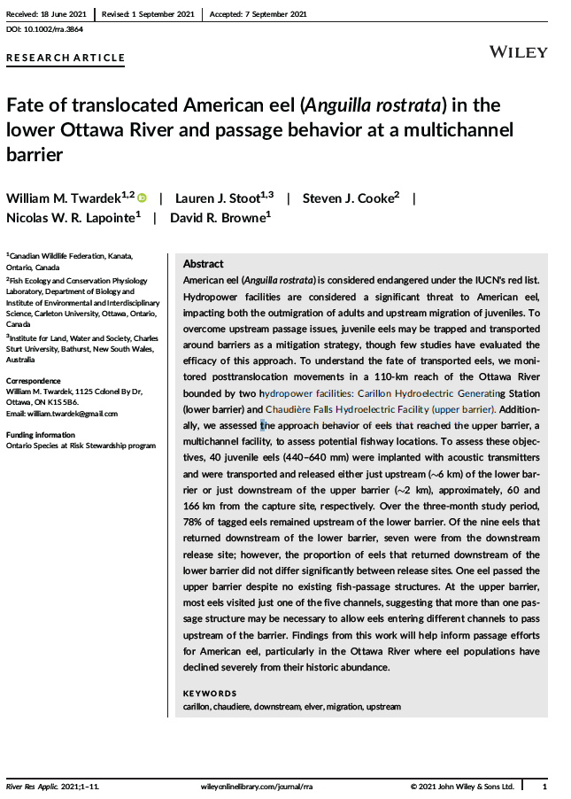 Fate of translocated American eel (Anguilla rostrata) in the lower Ottawa River and passage behavior at a multichannel barrier