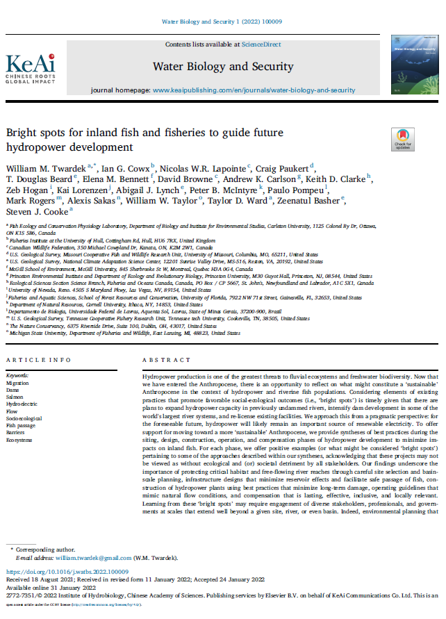 Hydropower production is one of the greatest threats to fluvial ecosystems and freshwater biodiversity. Now that we have entered the Anthropocene, there is an opportunity to reflect on what might constitute a ‘sustainable’ Anthropocene in the context of hydropower and riverine fish populations. Considering elements of existing practices that promote favorable social-ecological outcomes (i.e., ‘bright spots’) is timely given that there are plans to expand hydropower capacity in previously undammed rivers, intensify dam development in some of the world's largest river systems, and re-license existing facilities. We approach this from a pragmatic perspective: for the foreseeable future, hydropower will likely remain an important source of renewable electricity. To offer support for moving toward a more ‘sustainable’ Anthropocene, we provide syntheses of best practices during the siting, design, construction, operation, and compensation phases of hydropower development to minimize impacts on inland fish. For each phase, we offer positive examples (or what might be considered ‘bright spots’) pertaining to some of the approaches described within our syntheses, acknowledging that these projects may not be viewed as without ecological and (or) societal detriment by all stakeholders. Our findings underscore the importance of protecting critical habitat and free-flowing river reaches through careful site selection and basinscale planning, infrastructure designs that minimize reservoir effects and facilitate safe passage of fish, construction of hydropower plants using best practices that minimize long-term damage, operating guidelines that mimic natural flow conditions, and compensation that is lasting, effective, inclusive, and locally relevant. Learning from these ‘bright spots’ may require engagement of diverse stakeholders, professionals, and governments at scales that extend well beyond a given site, river, or even basin. Indeed