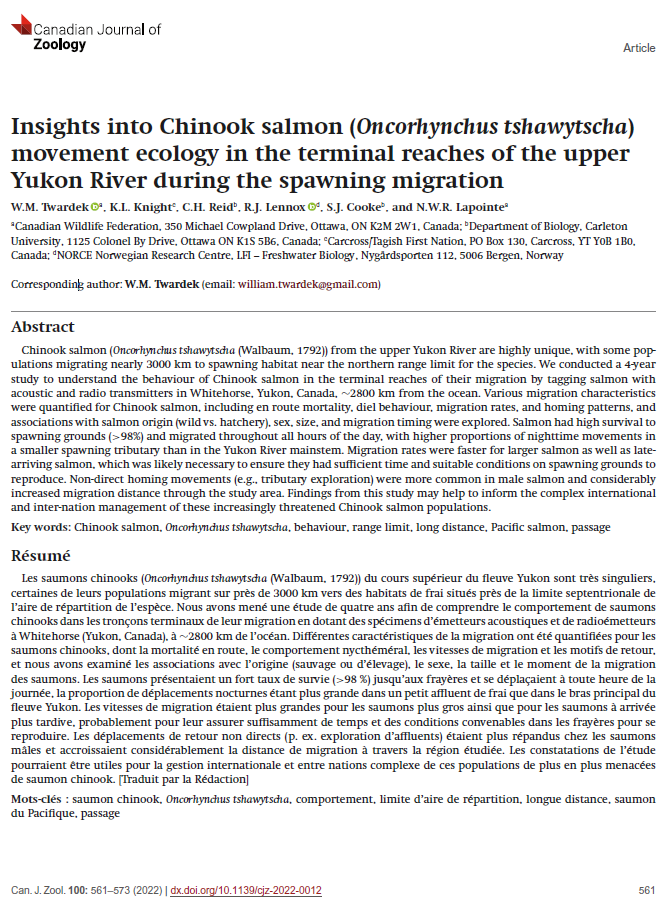 Chinook salmon (Oncorhynchus tshawytscha (Walbaum, 1792)) from the upper Yukon River are highly unique, with some populations migrating nearly 3000 km to spawning habitat near the northern range limit for the species. We conducted a 4-year study to understand the behaviour of Chinook salmon in the terminal reaches of their migration by tagging salmon with acoustic and radio transmitters in Whitehorse, Yukon, Canada, ∼2800 km from the ocean. Various migration characteristics were quantified for Chinook salmon, including en route mortality, diel behaviour, migration rates, and homing patterns, and associations with salmon origin (wild vs. hatchery), sex, size, and migration timing were explored. Salmon had high survival to spawning grounds (>98%) and migrated throughout all hours of the day, with higher proportions of nighttime movements in a smaller spawning tributary than in the Yukon River mainstem. Migration rates were faster for larger salmon as well as latearriving salmon, which was likely necessary to ensure they had sufficient time and suitable conditions on spawning grounds to reproduce. Non-direct homing movements (e.g., tributary exploration) were more common in male salmon and considerably increased migration distance through the study area. Findings from this study may help to inform the complex international and inter-nation management of these increasingly threatened Chinook salmon populations