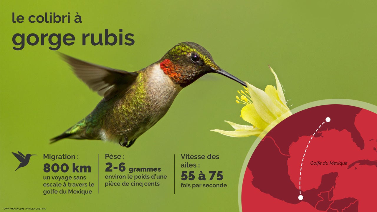 Le colibri à gorge rubis (Archilochus colubris) est le colibri le plus commun et le plus répandu au Canada. Pesant entre deux et six grammes (à titre de comparaison, une pièce de cinq cents pèse environ quatre grammes), le colibri à gorge rubis quitte son aire de reproduction septentrionale pour entamer son voyage vers l'Amérique centrale en vue d'y passer l'hiver. Certains traversent le golfe du Mexique, un incroyable voyage de 800 kilomètres sans escale, tandis que d'autres empruntent un chemin côtier autour du golfe.