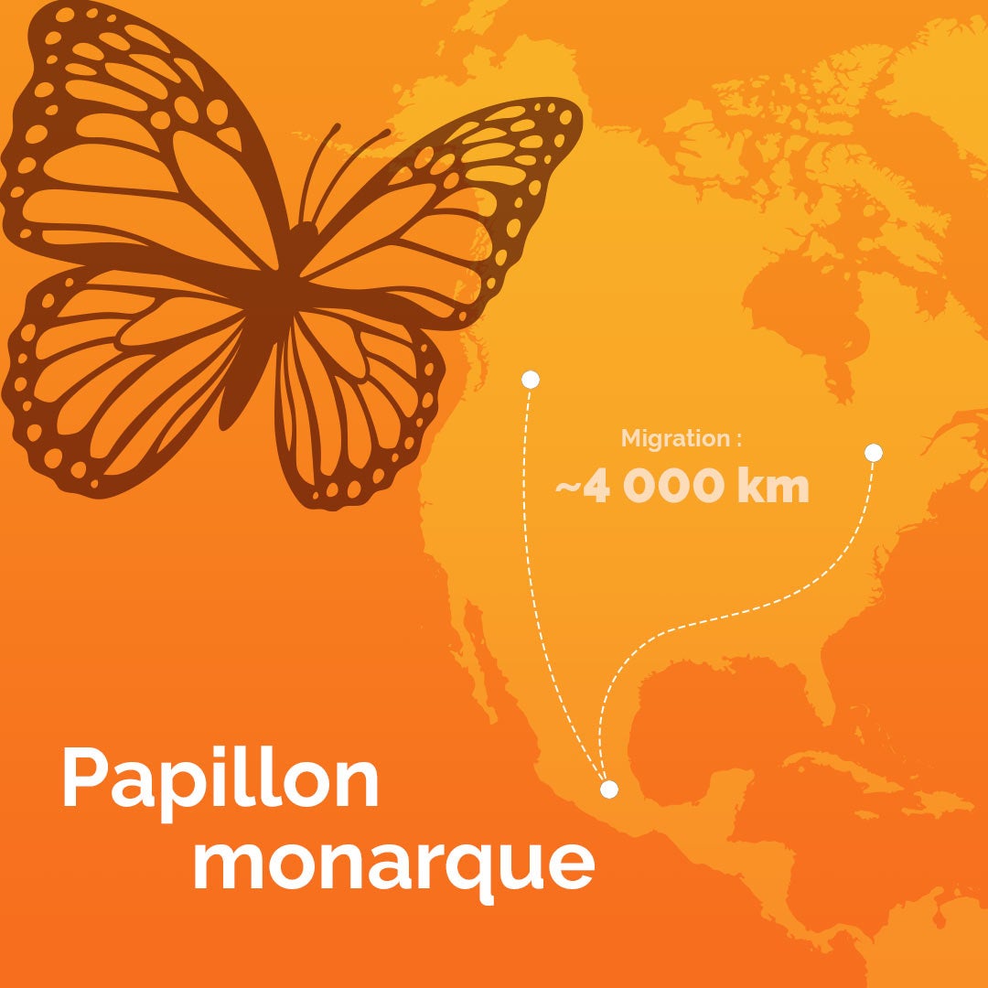Le papillon monarque migre sur des milliers de kilomètres (environ 4 000 km) en grand nombre deux fois par an, un exploit que seule une petite poignée d'espèces d'insectes accomplit sur Terre! Les papillons monarques migrateurs se perchent dans les arbustes et les arbres la nuit et peuvent être vus par centaines dans des perchoirs le long des rives des lacs Ontario et Érié. Les papillons monarques s'orientent pendant la migration d'automne et du printemps à l'aide de récepteurs situés dans leurs yeux et leurs antennes.